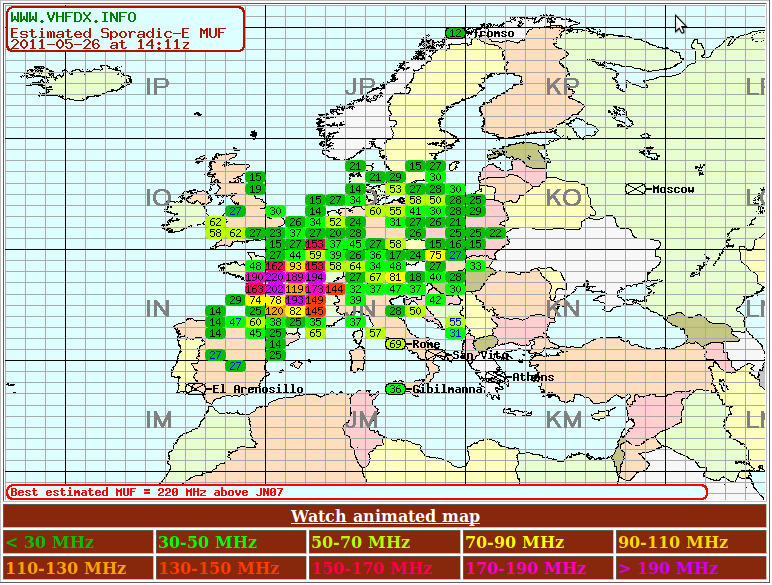 Une magnifique ouverture sporadique E est en cours au moment où j’écris ces lignes, ceci sur VHF. Malheureusement je ne suis pas à la station en ce moment et de toute façon je serrais que spectateur car je me trouve presque au centre et de ce fait tout se passe au dessus de ma tête. Une ouverture de cette ampleur en mai n’est pas rare mais n’est pas banal tout de même…