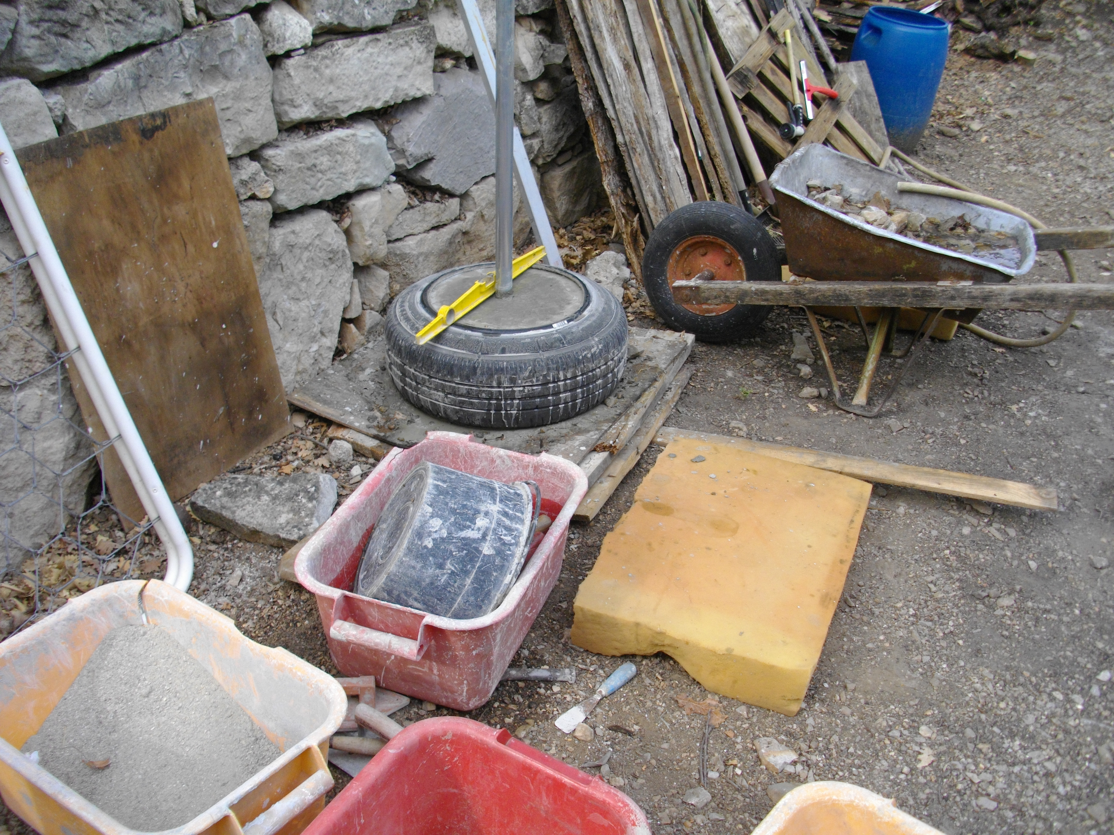 Étant en vacances et ayant envie de profiter de la grande surface environnante pour pouvoir faire quelques essais d’antennes, il me fallait trouver une solution pour installer différentes antennes sur un support déplaçable. La solution était de fabriquer ce support avec les moyens du bord. Il a suffit d’un vieux pneu récupéré dans un garage, un peu de béton et un élément de mat de télévision que l’on trouve partout dans les magasins de bricolage. Après un jour de séchage, c’est opérationnel avec une antenne tonna 5 éléments 6 mètres.