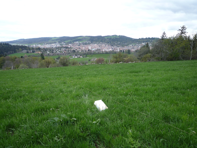 Un dimanche à priori pluvieux, on reste au chaud chez soi… Et bien non ! C’est pas souvent que les radiosondes de Payerne viennent tutoyer nos montagnes. Mais là. c’est presque incroyable, il en vient pas loin de une par jour en ce moment. Tantôt au sud du lac de Neuchâtel, tantôt au nord… Cette nuit j’ai laissé tourner la station de monitoring et ce matin vers 6h je constate qu’une RS c’est posée aux Pontins, entre Chasseral et St-Imer. Je connais bien cet endroit alors je me décide d’aller la chercher. Il pleut et il fait froid. Depuis le QRA je la perd à 1700 m. du sol. Une fois sur place, je constate un problème avec mon PC, par chance, j’arrive à résoudre le cas et peut enfin décoder la sonde pour avoir la position exacte. Ensuite c’est le GPS qui me fait des siennes, il fait froid et tout est mouillé, je pars dans la direction opposée… Puis finalement je la retrouve au pieds de la forêt. Bizarre, je ne retrouve aucune trace du ballon, pas une miette, même pas l’embout de gonflage… J’embarque le tout et me rend voir les amis de la SEMONE qui font le contest H26 avec l’indicatif du club HB9LC. Je fait une heure de trafic puis je rentre au QRA. Vers 13h, je regarde le site de prédiction et je constate que la RS de 13h pourrait se poser dans le Val-de-Ruz, c’est à 20 min en voiture, hop me voilà reparti. Une fois sur place la RS stagne sur le lac près de Boudry, je me dit que c’est mieux d’aller dans cette région, c’est à 15 min. Arrivé à Boudry, la RS était dans le Val-de-Ruz… Je remonte et finalement cette RS ne voulait pas trop vite descendre, elle continue son vol jusqu’au Mont Cornu, tout près de la ville de La Chaux-de-Fonds. J’ai fait le tour du canton alors qu’elle s’est posée à moins de 10 Km du QRA ! Cette fois il ne pleut plus et mon GPS fonctionne correctement. Avec les coordonnées reçues de la RS, je la trouve rapidement (voir photo avec la ville de La Chaux-de-Fonds en arrière plan). Elle c’est posée dans un champs à environ 900m de la route la plus proche.