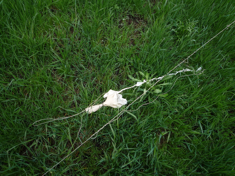 Le ballon en latex a littéralement exposé, il en reste un tout petit bout. (voir 2ème photo). Vu mon dégagement, je me dis qu’il est bien de signaler la récupération sur 145.550 MHz, j’ai bien fait car Jean-Claude F5HLQ est arrivé juste 15-20 minutes trop tard. On se croise et nous décidons de s’arrêter dans un parking pour se serrer la main. Sympa.